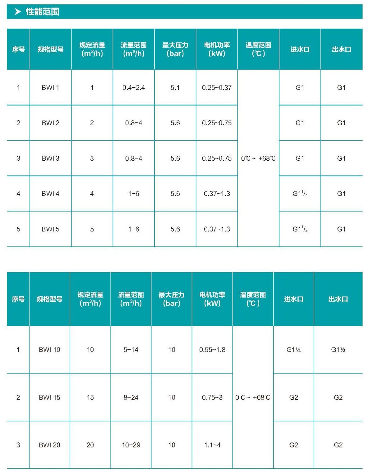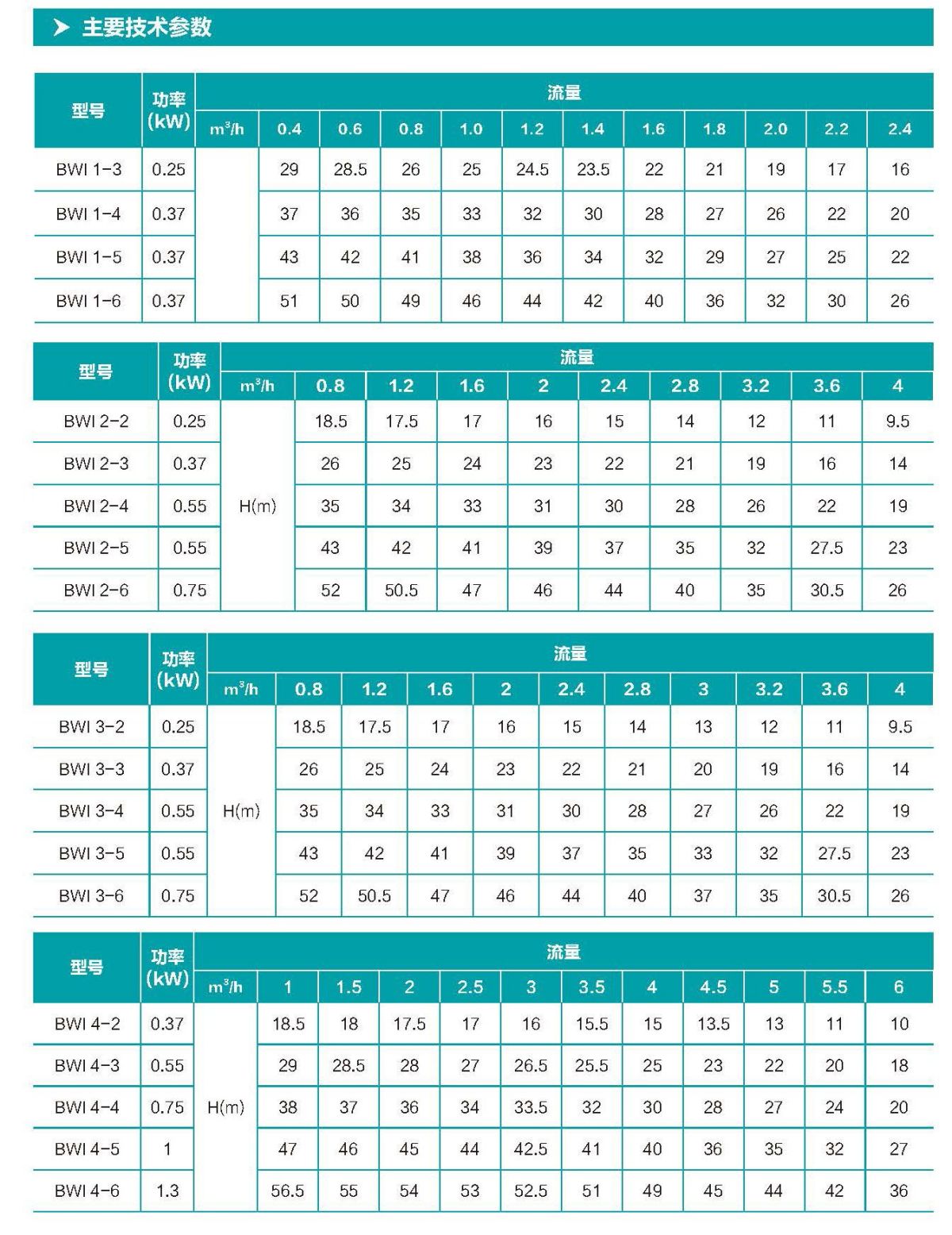 BWI 系列新型輕型不銹鋼臥式多級離心泵是一種多用途非自 吸臥式多級離心泵。該系列產品具有效率高、噪音低、運行 平穩等特點。整體緊湊 , 安裝簡單,使用維護方便。過流部 分選用優質 304 不銹鋼沖壓焊接成型。